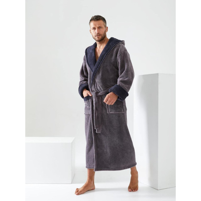 Виріб являє собою довгий однотонний халат з капюшоном, поясом, кишенями.