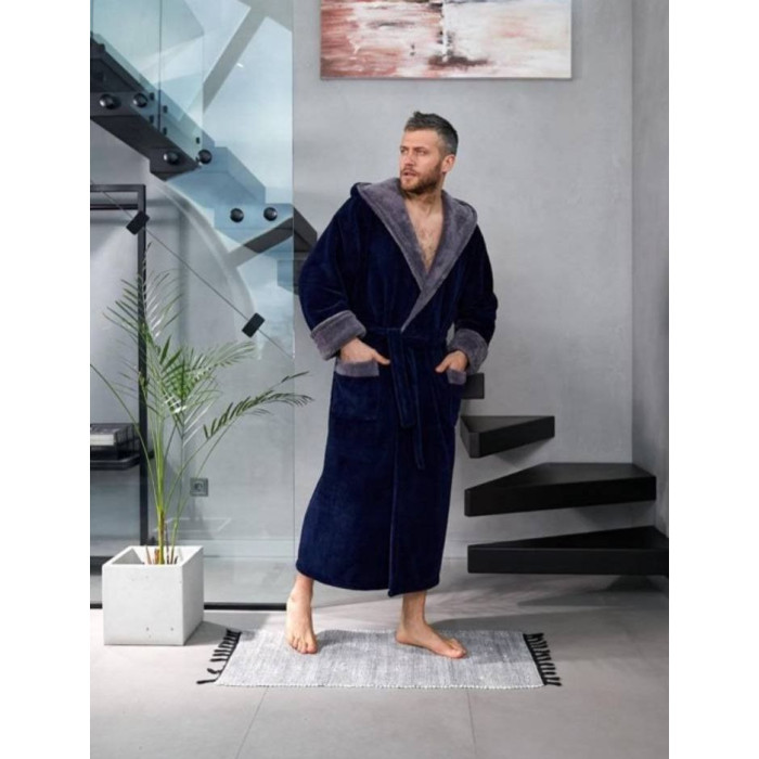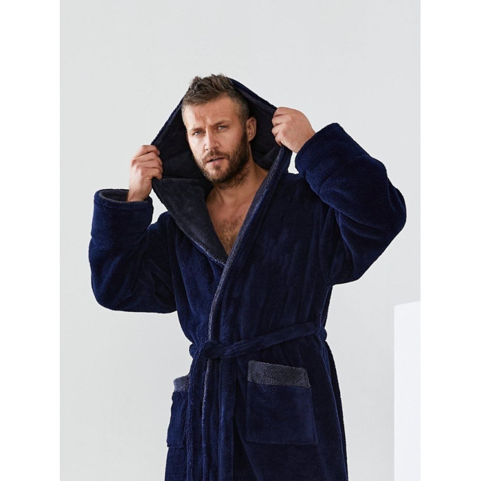 Чоловічий махровий халат на запах колір синій розміри 52-56
