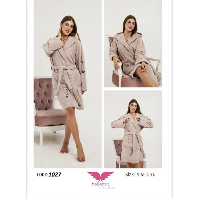 Виріб являє собою не довгий однотонний халат з капюшоном, поясом, кишенями.