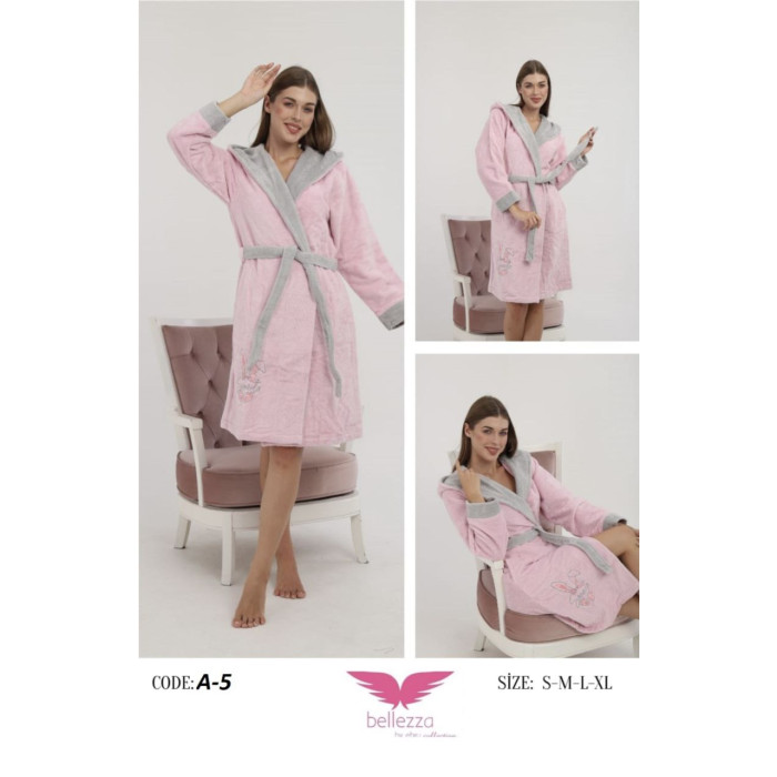 Виріб являє собою не довгий однотонний халат з капюшоном, поясом, кишенями.