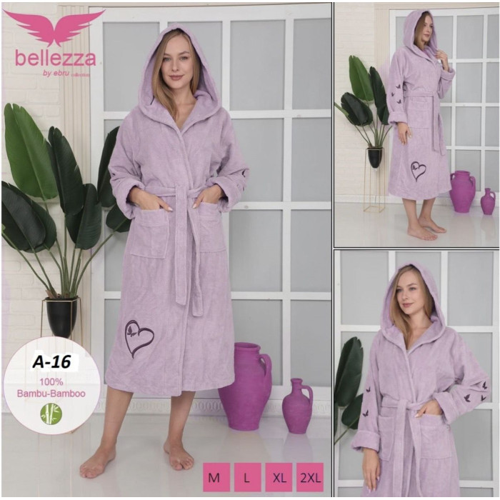 Виріб являє собою довгий однотонний халат з капюшоном, поясом, кишенями.