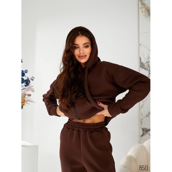 Кофта костюма вільного крою на блискавці, зручними кишенями типу «кенгуру» та рукавами на манжетах.